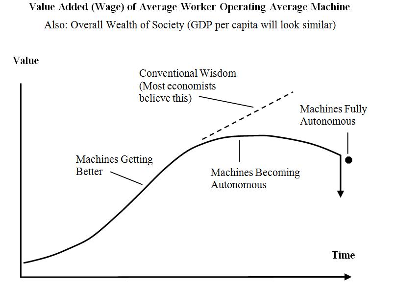This point here is that a worker is also a consumer (and may support other consumers). These people drive final demand. When a worker is replaced by a machine, that machine does not go out and consume. The machine may use resources and spare parts, but again, those are business inputs—not final demand. If there is no one to buy what the machine is producing it will get shut down. So if we automate all the jobs, or most of the jobs, or if we drive wages so low that very few people have any discretionary income, then it is difficult to see how a modern mass-market economy can survive that. (This is the primary focus of my book, The Lights in the Tunnel).